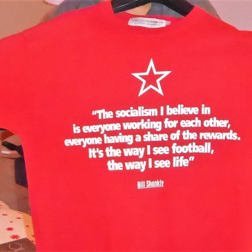 When I wear the tee-shirt I feel a little bit nostalgic for several reasons. First, it evokes a more innocent time when football was a working-class game instead of a money laundering scheme involving oligarchs, sheikhs, television, agents and players. Second, it reminds me of a time when many of the top football managers and players in England were Scottish – characters like Matt Busby, Denis Law, Kenny Dalglish and Alex Ferguson. Third, the quote takes us back to the swinging sixties and seventies, a time of great social progress when (in the UK, at least) socialism was in the ascendancy.